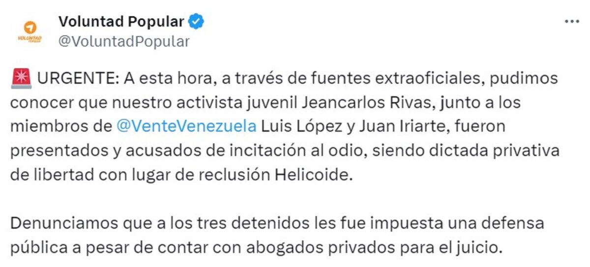 Vente Venezuela también se pronunció y pidió la liberación inmediata de los tres activistas políticos.