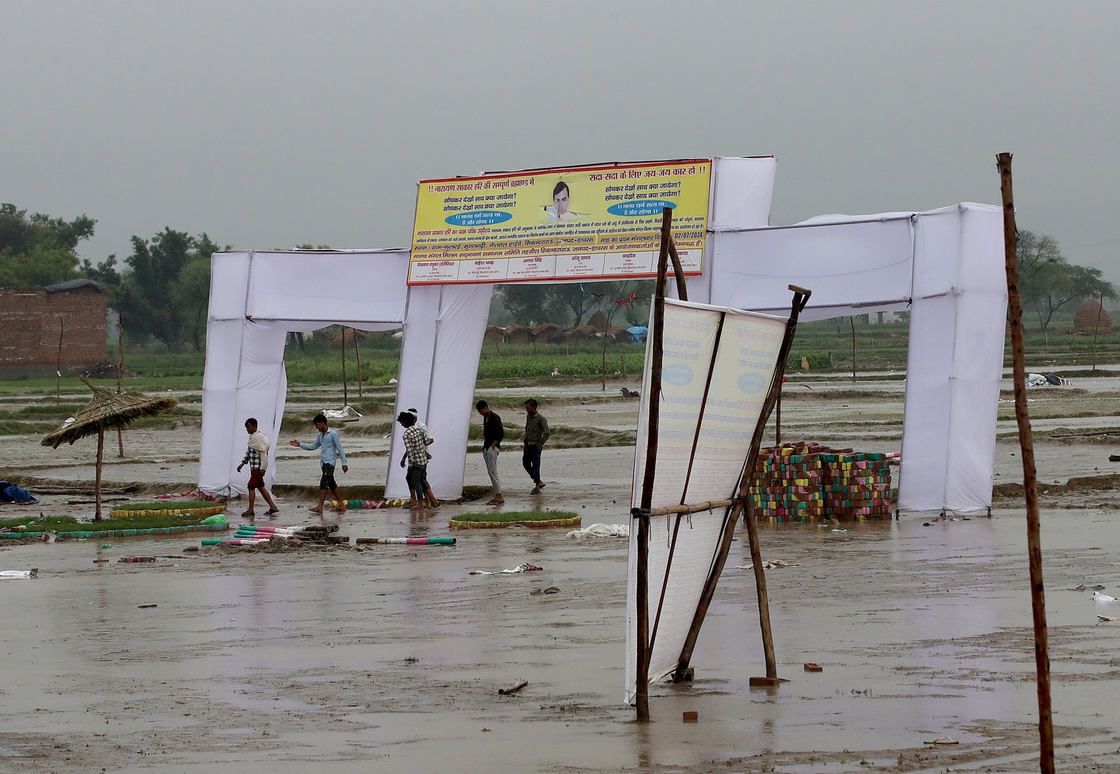 La ceremonia religiosa, una especie de acto de oración organizado por Bhole Baba, ocurrió en un amplio descampado, en cuya zona central se erigía una estructura de andamios y telas para albergar a gran parte de la inmensa cifra de asistentes.