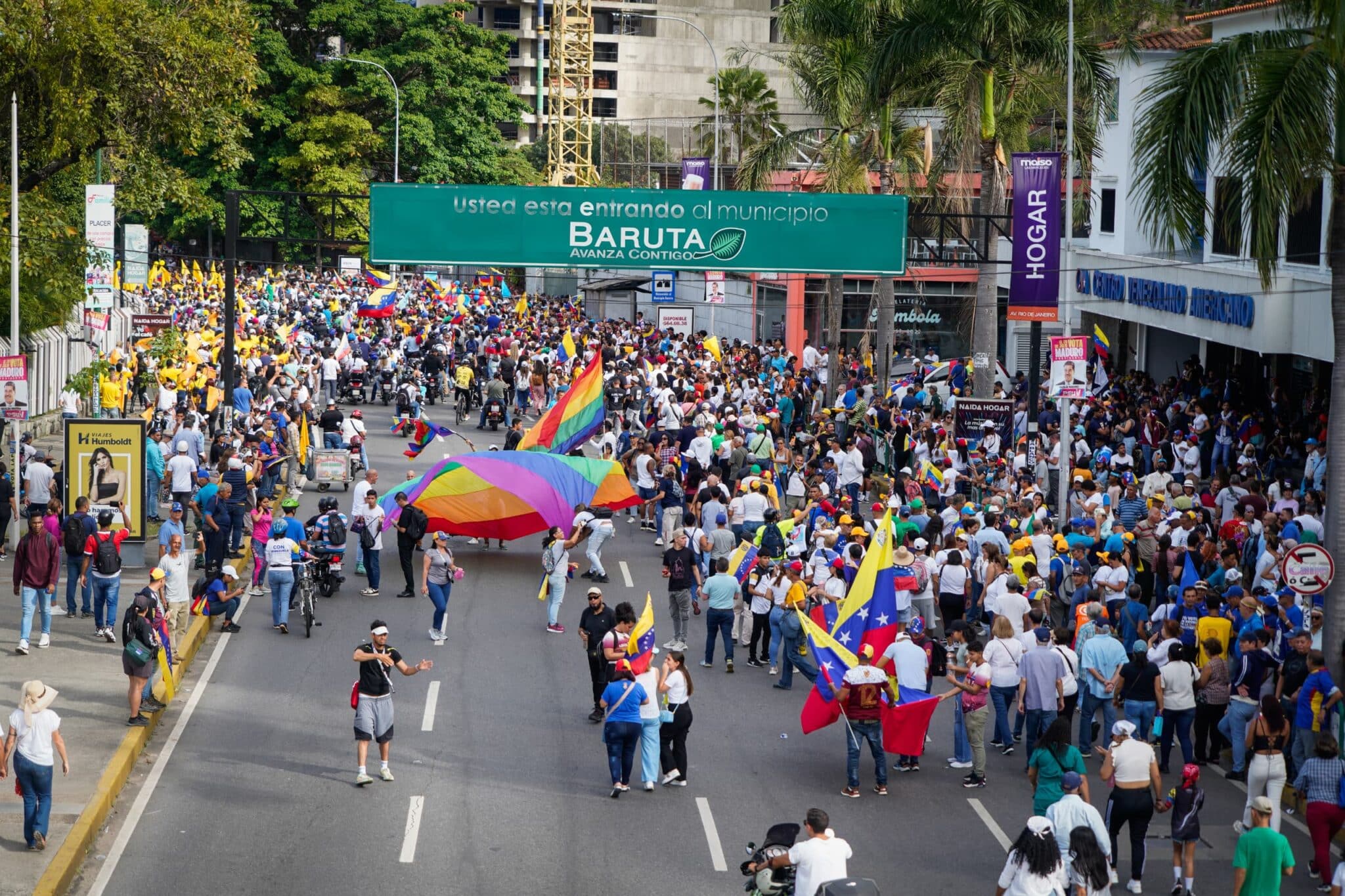 - Entre consignas como «libertad y fuera Maduro», los asistentes a la concentración opositora recibieron al candidato presidencial Edmundo González Urrutia y a la líder María Corina Machado, quienes llegaron en una caravana a la plaza Alfredo Sadel para el cierre de campaña electoral