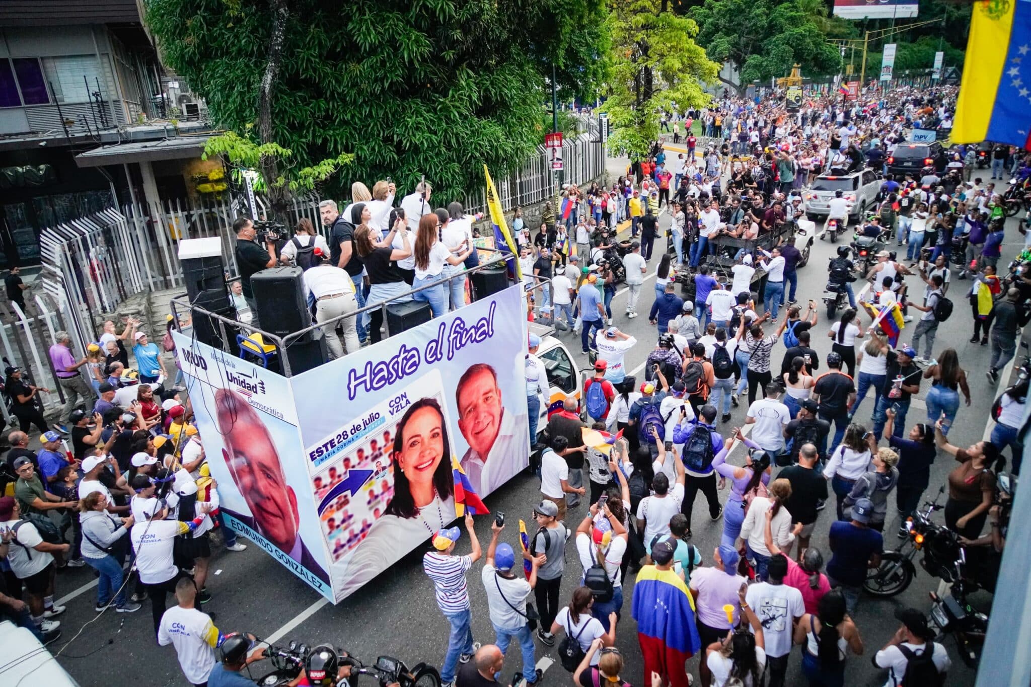 Entretanto, la líder opositora María Corina Machado y Edmundo González se dirigieron a la concentración en Las Mercedes en un camión rotulado con imágenes del propio candidato presidencial opositor y desde la sede del partido de Vente Venezuela en Caracas.